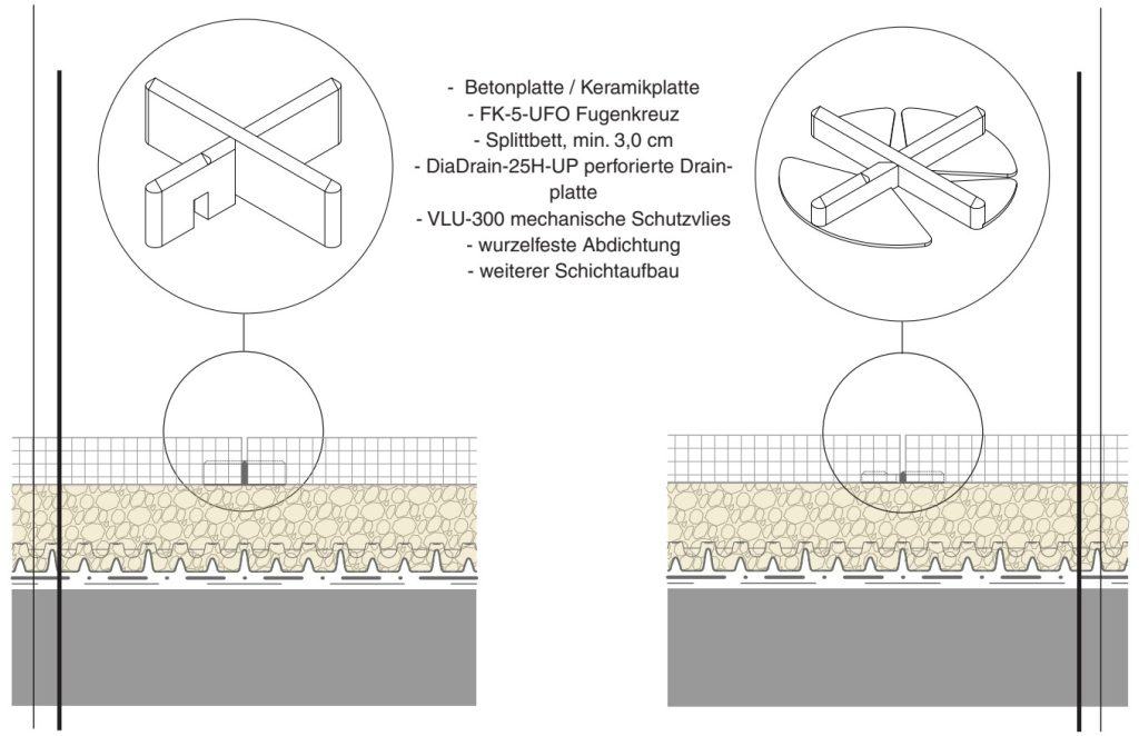 Die FK-UFO Fugenkreuze erleichtern die Verlegung der Bodenplatten, bieten einen stabilen Halt und ermöglichen ein einheitliches Fugenbild, wodurch nicht nur die Ästhetik, sondern auch das Wasserableitvermögen gesteigert wird.